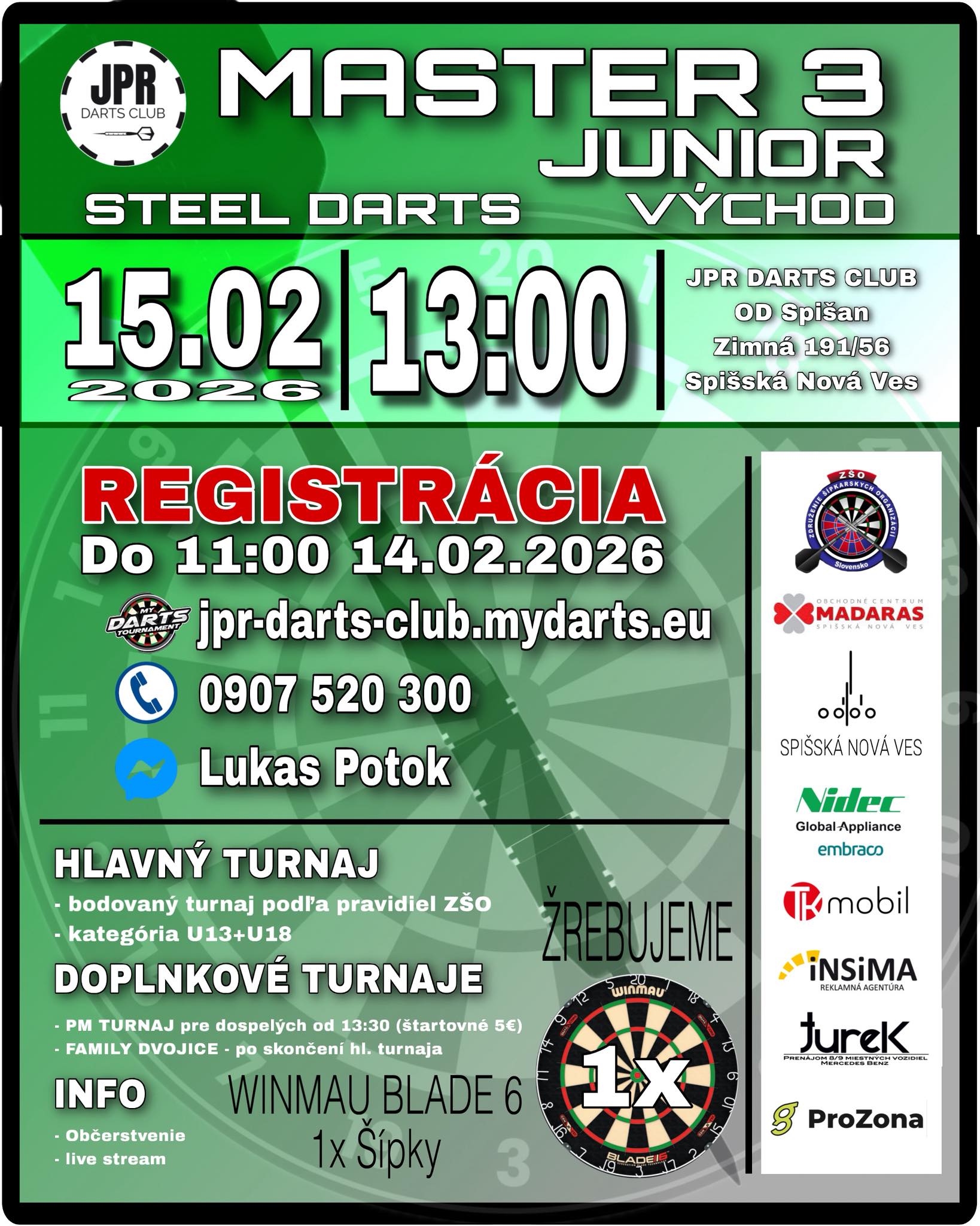 Juniorský Master č.3 pre Prešovský a Košický kraj sa uskutoční v nedeľu 15. 2. 2026 pod záštitou JPR Darts Clubu.